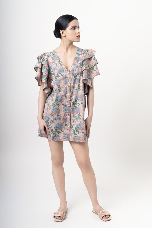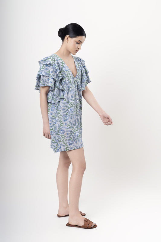 Indulge in the luxurious comfort and style of our Button Mini Dress. Crafted from 100% cotton, this dress features a flattering easy fit and a V neckline. The ruffled sleeves and front button placket add a touch of ease and grace to this exclusive piece, made in our signature handmade block prints.